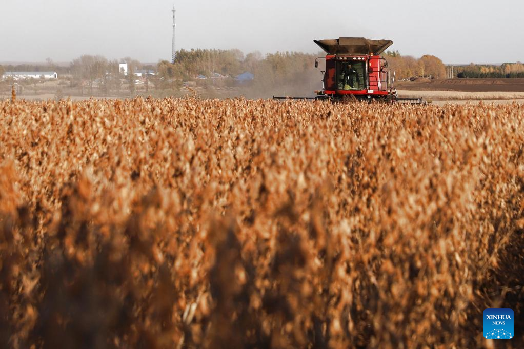 A harvester works in soybean fields at a farm of Beidahuang Group in northeast China's Heilongjiang Province, Oct. 3, 2024. (Photo by Hou Yue/Xinhua)