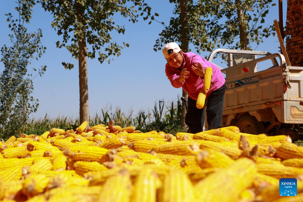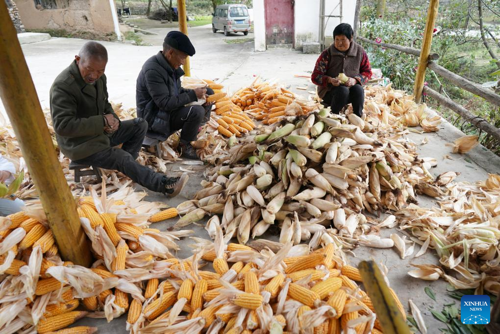 Farmers shuck corn in Kuyuhe Village of Chang'an District in Xi'an City, northwest China's Shaanxi province, Oct. 1, 2024. (Xinhua/Shao Rui)