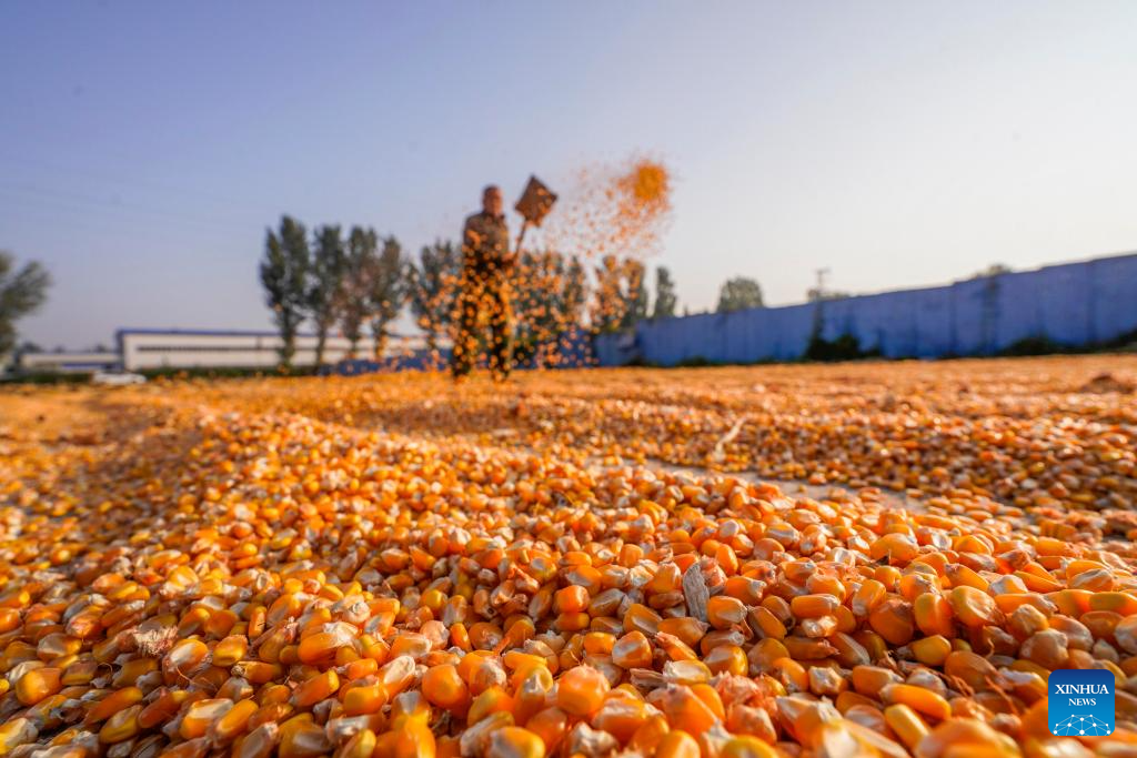 A farmer dries the corn in Dongxinzhuang Village of Zunhua City, north China's Hebei Province, Oct. 4, 2024. (Photo by Liu Mancang/Xinhua)