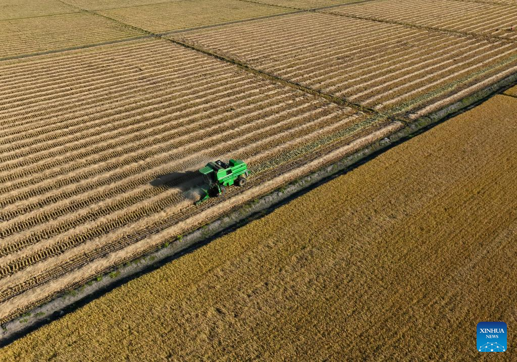 An aerial drone photo shows a harvester working in rice paddies at a farm of Beidahuang Group in northeast China's Heilongjiang Province, Oct. 3, 2024. (Photo by Dang Aihe/Xinhua)