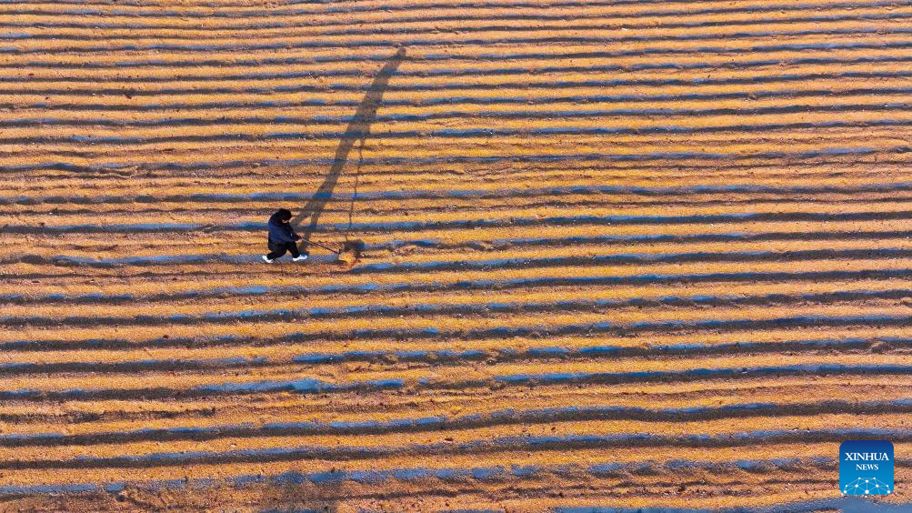 A farmer airs corn in Zhaizhuang Village of Chiping District in Liaocheng City, east China's Shandong Province, Oct. 1, 2024. (Photo by Ma Hongkun/Xinhua)