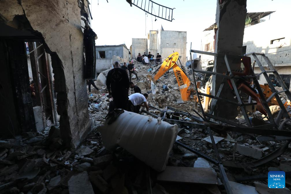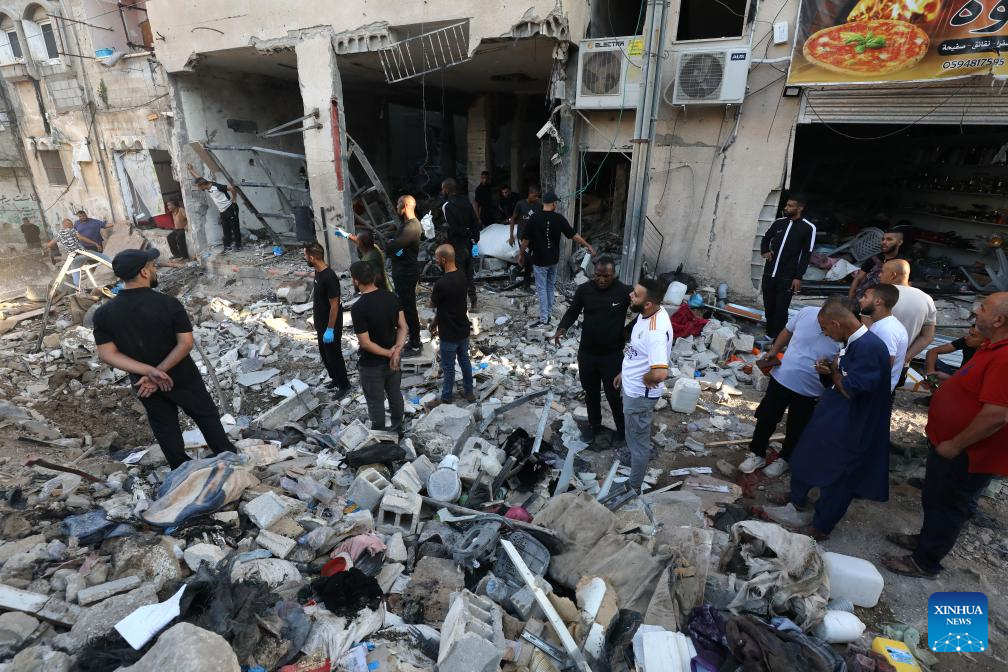 Palestinians inspect the damage of a site after an Israeli airstrike in Tulkarm refugee camp in the northern West Bank, on Oct. 4, 2024. At least 18 Palestinians were killed and many others wounded in an Israeli airstrike targeting the Tulkarm refugee camp in the northern West Bank on Thursday, the Palestinian Ministry of Health said in a brief statement. (Photo by Nidal Eshtayeh/Xinhua)