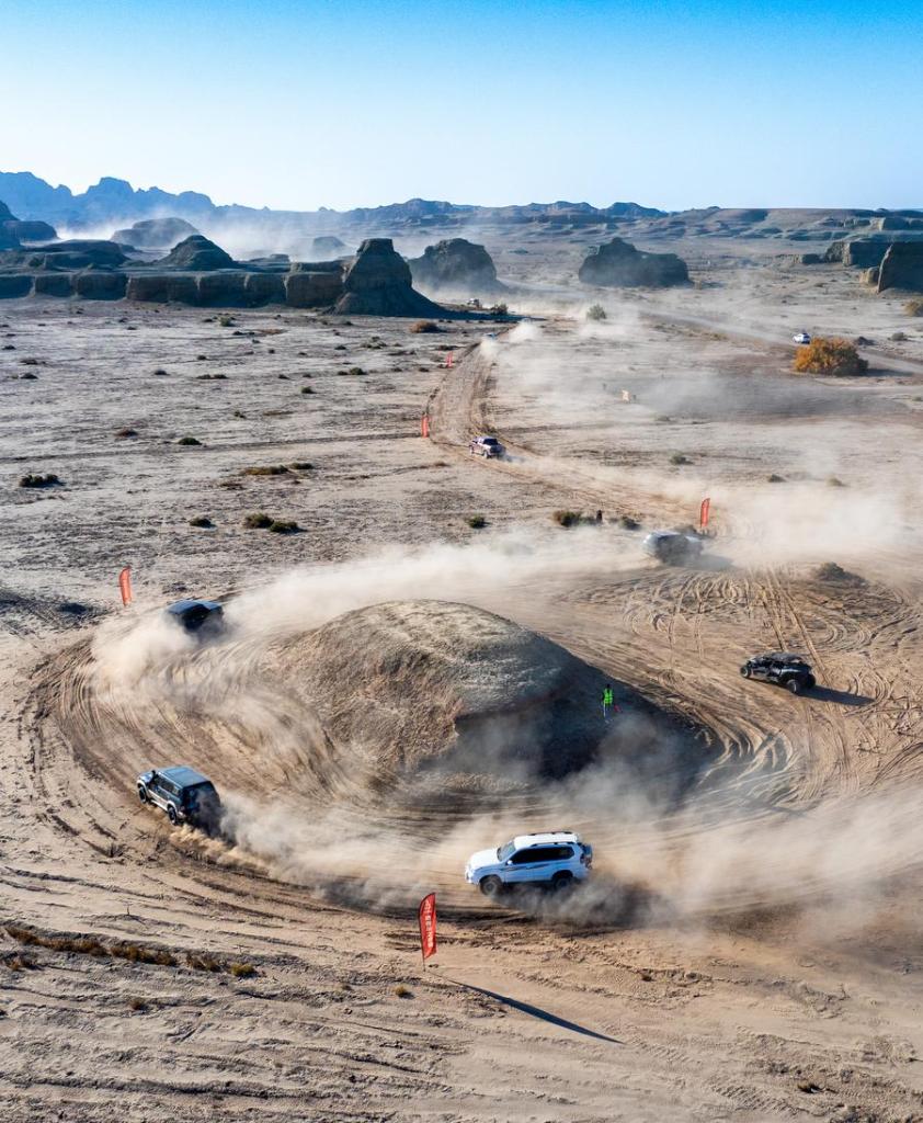 An aerial drone photo taken on Oct. 5, 2024 shows tourists taking part in an off-road challenge in World Mystery Town of Karamay in Urho District of Karamay, northwest China's Xinjiang Uygur Autonomous Region. (Photo by Min Yong/Xinhua)