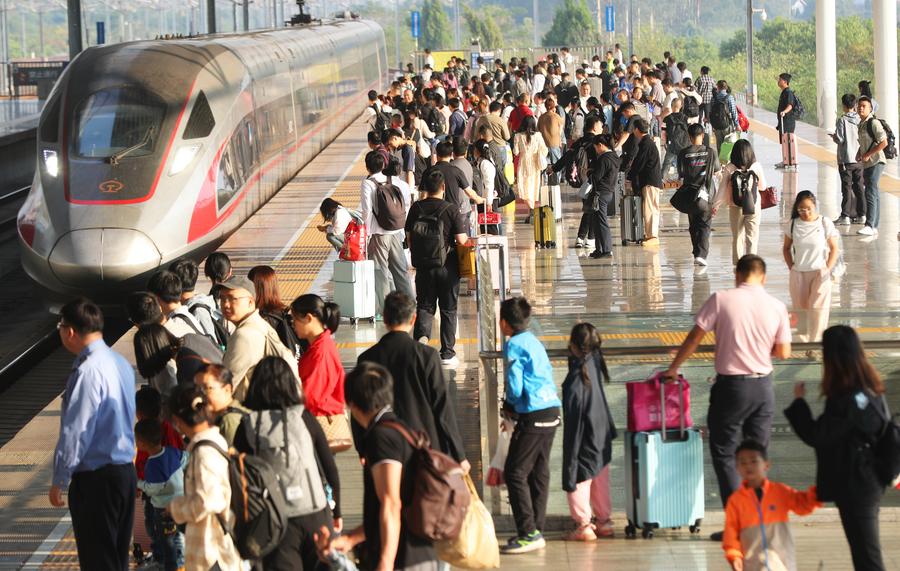 Passengers wait to board a train at the platform at Hengyang East Railway Station in Hengyang City, central China's Hunan Province, Oct. 6, 2024. (Photo by Cao Zhengping/Xinhua)