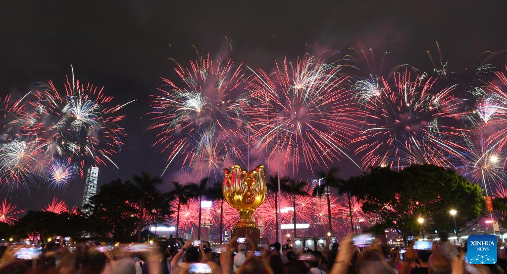 Fireworks celebrating the 75th anniversary of the founding of the People's Republic of China illuminate the sky over Victoria Harbour in Hong Kong, Oct 1, 2024. (Photo/Xinhua)