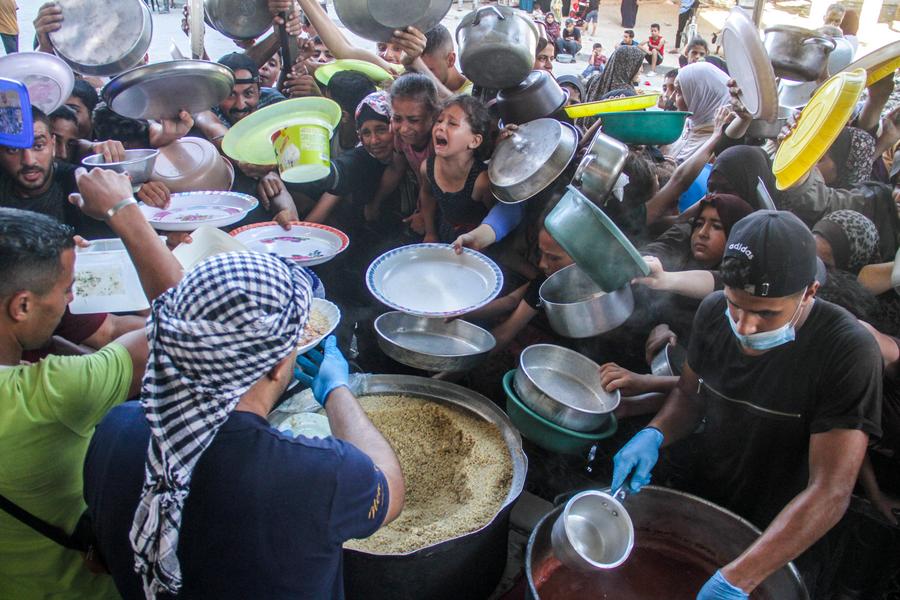 People try to get food relief in the northern Gaza Strip town of Beit Lahia, on July 18, 2024. (Photo by Mahmoud Zaki/Xinhua)