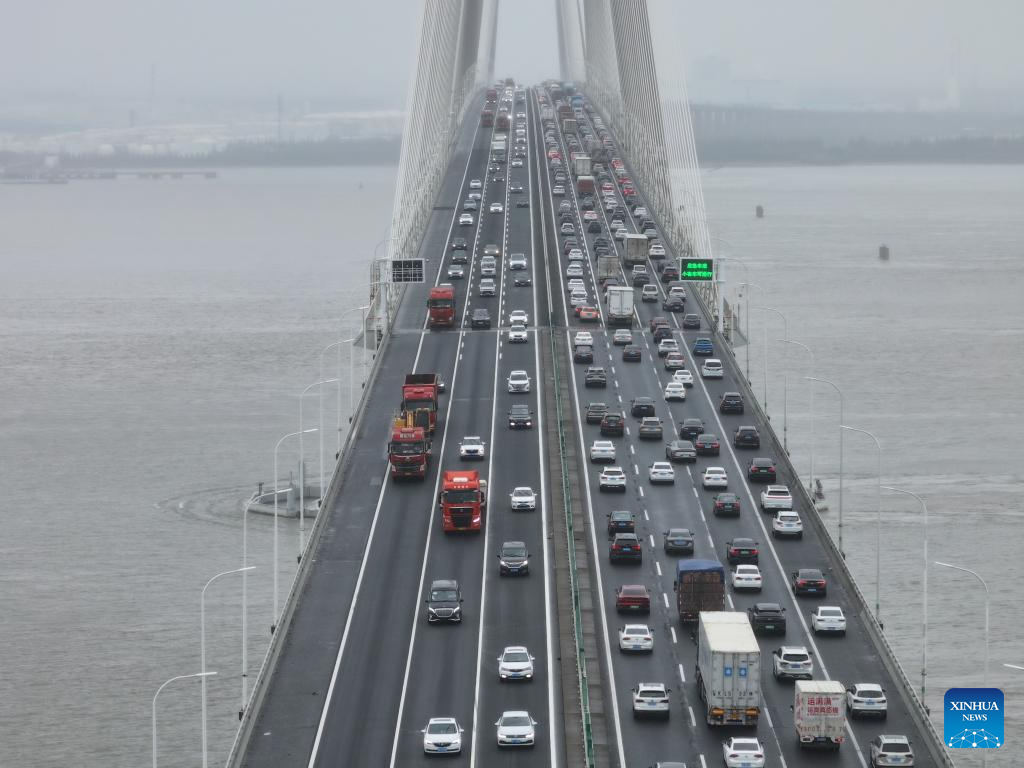 An aerial drone photo taken on Oct. 6, 2024 shows the traffic on a bridge in Nantong, east China's Jiangsu Province. China sees a surge in return trips on Sunday as the week-long National Day holiday draws to a close. (Photo by Xu Congjun/Xinhua)