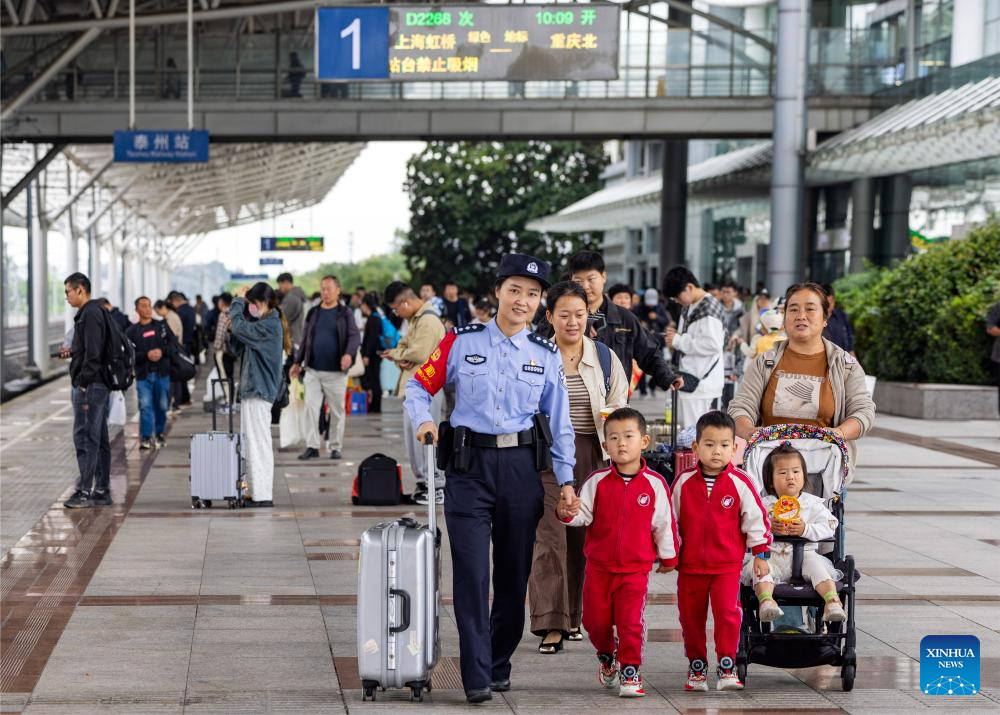 A policewoman helps passengers on the platform at Taizhou Railway Station in Taizhou, east China's Jiangsu Province, Oct. 6, 2024. China sees a surge in return trips on Sunday as the week-long National Day holiday draws to a close. (Photo by Tang Dehong/Xinhua)