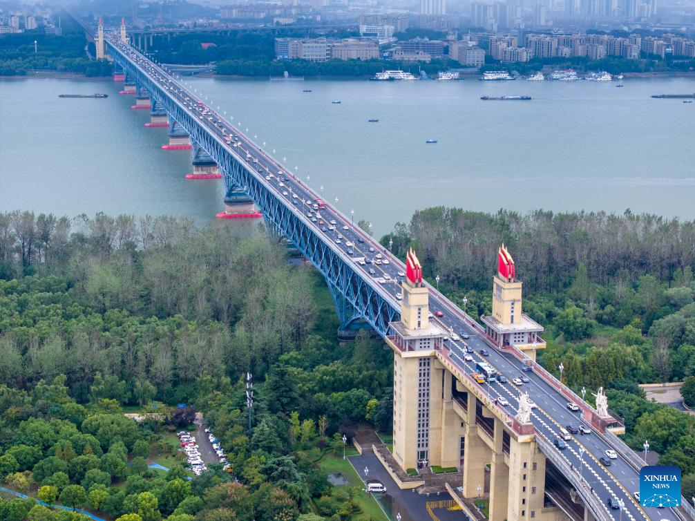 An aerial drone photo taken on Oct. 6, 2024 shows the traffic on the Nanjing Yangtze River Bridge in Nanjing, east China's Jiangsu Province. China sees a surge in return trips on Sunday as the week-long National Day holiday draws to a close. (Photo by Yang Suping/Xinhua)