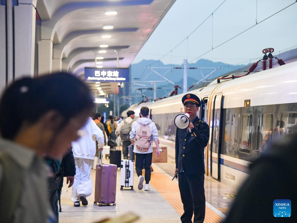 A staff member guides passengers at Bazhong East Railway Station in Bazhong City, southwest China's Sichuan Province, Oct. 6, 2024. (Xinhua/Wang Xi)