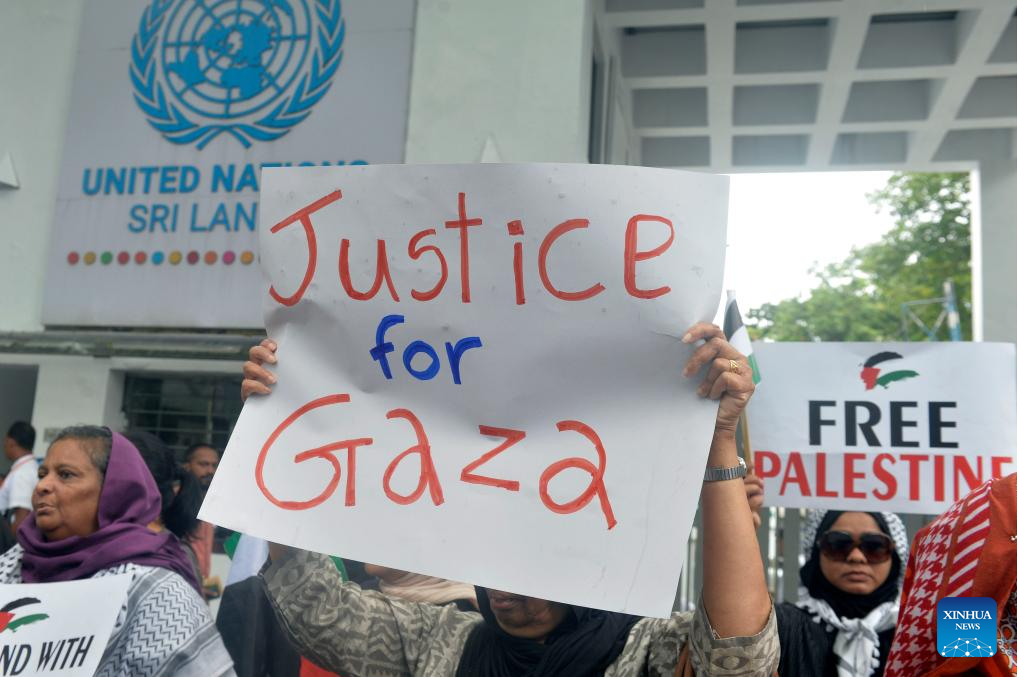 A protester holds a poster during a demonstration in support of Gaza in front of the United Nations (UN) office in Colombo, Sri Lanka on Oct. 7, 2024. People participated in demonstrations in many places around the world, voicing their support for Palestine and Lebanon, as the latest round of Gaza conflict marked one year. (Photo by Gayan Sameera/Xinhua)