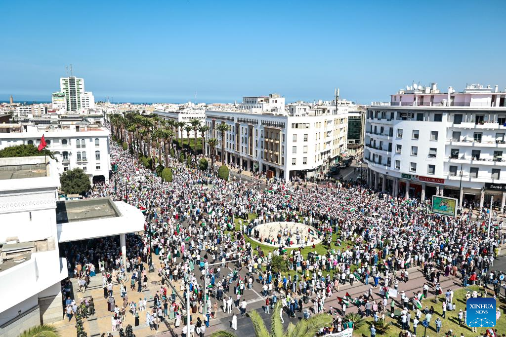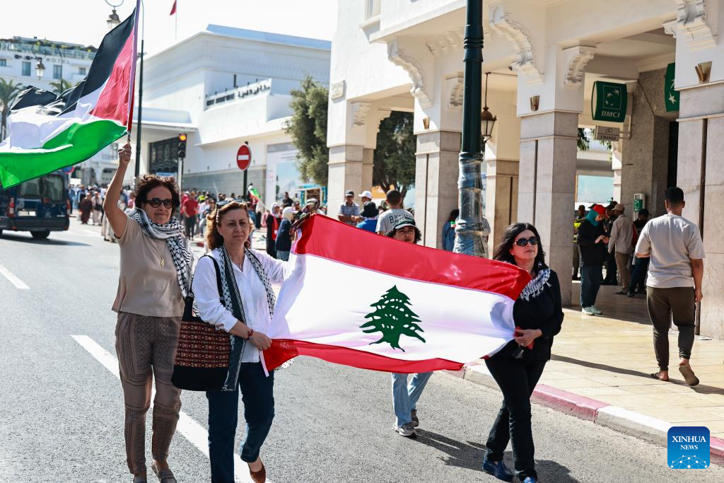 People gather in a rally to support Palestinians and Lebanese in downtown Rabat, Morocco, on Oct. 6, 2024. People participated in demonstrations in many places around the world, voicing their support for Palestine and Lebanon, as the latest round of Gaza conflict marked one year. (Xinhua/Huo Jing)