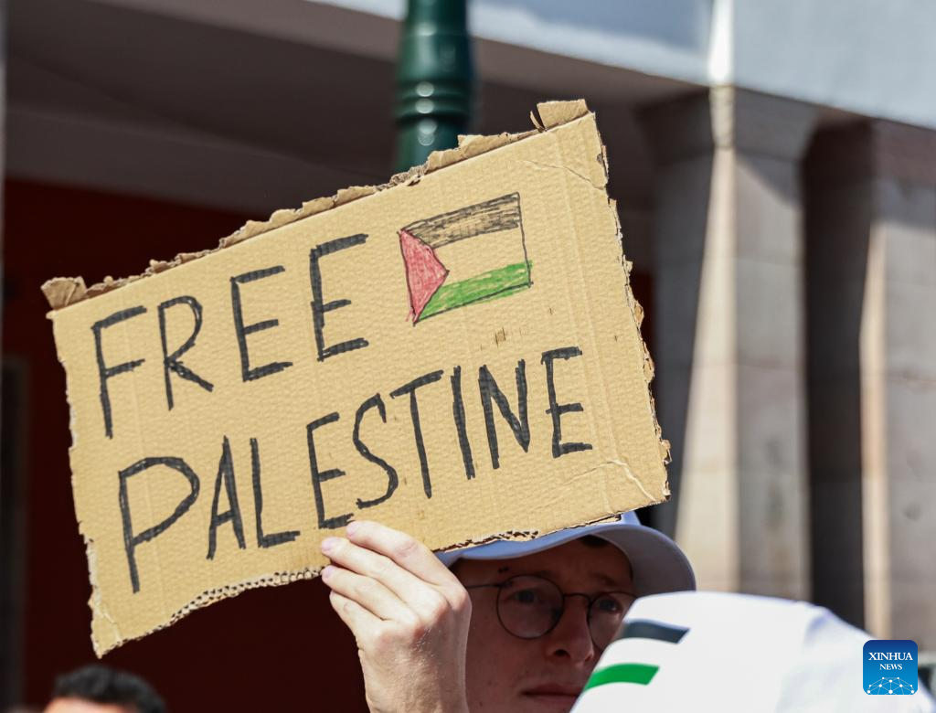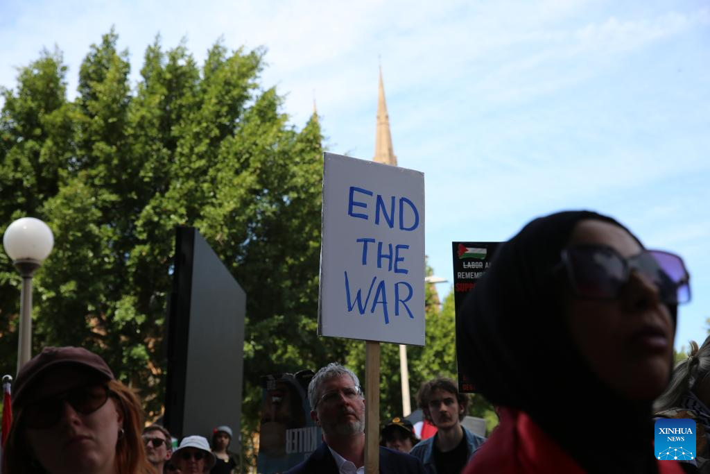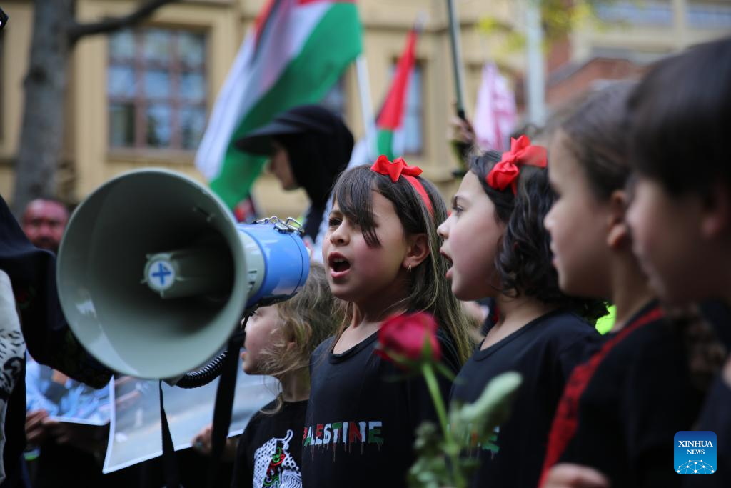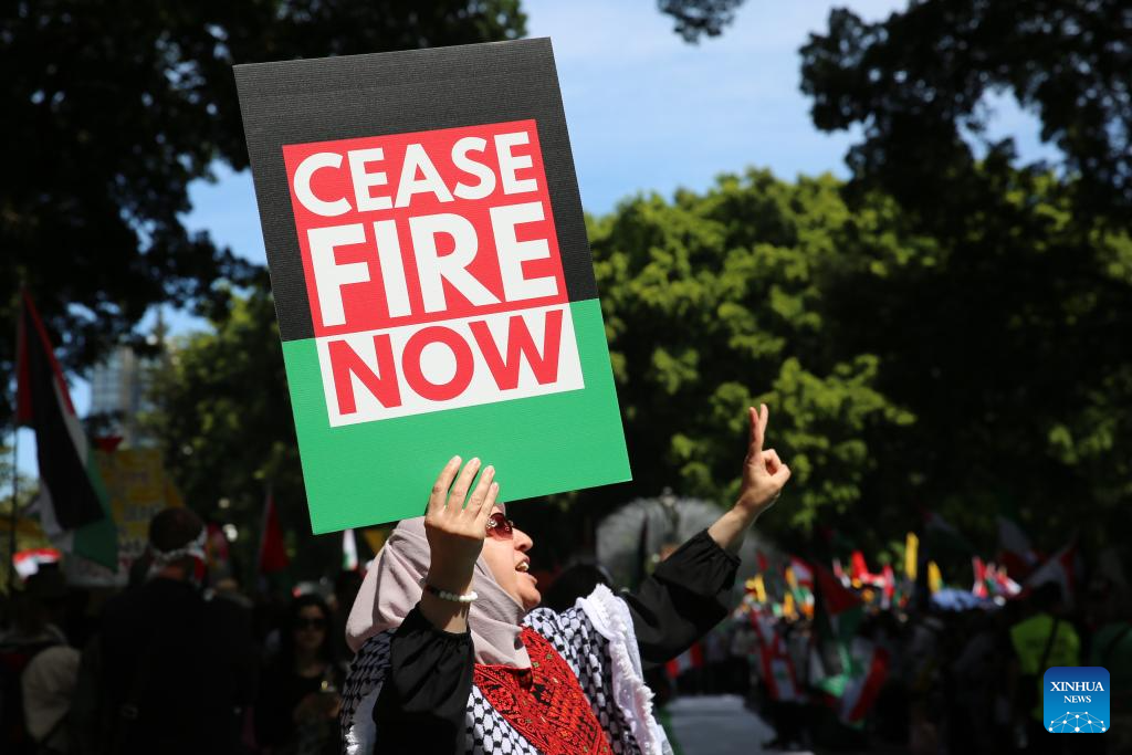 Protesters participate in a demonstration in support of Palestine and Lebanon in Sydney, Australia, Oct. 6, 2024. People participated in demonstrations in many places around the world, voicing their support for Palestine and Lebanon, as the latest round of Gaza conflict marked one year. (Xinhua/Liang Youchang)
