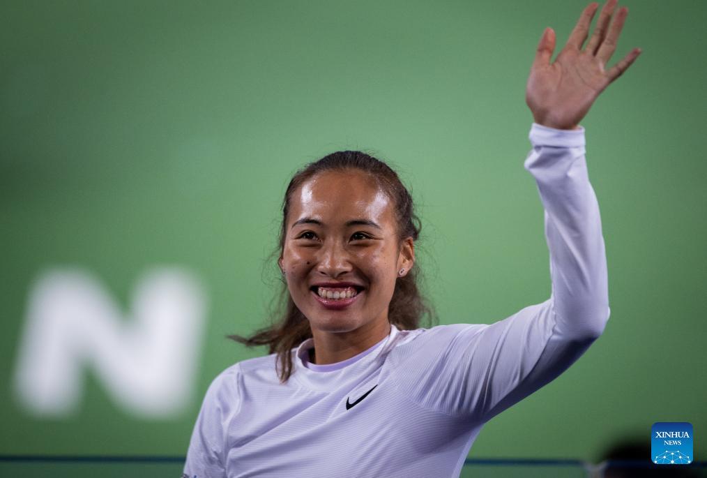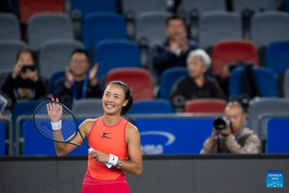 Chinese tennis player Zheng Qinwen greets spectators during the opening ceremony of the 2024 Wuhan Open tennis tournament in Wuhan, capital of central China's Hubei Province, Oct. 7, 2024. (Xinhua/Hu Jingwen)