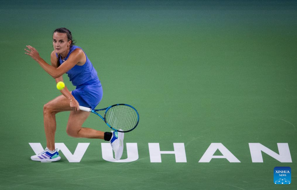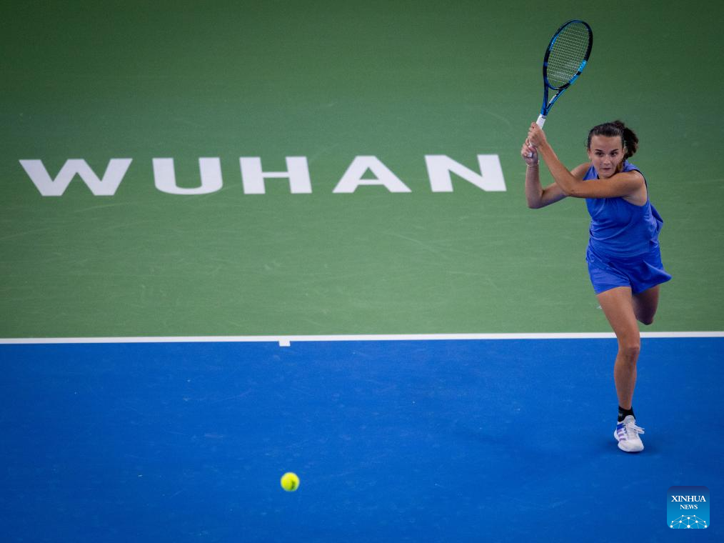 Clara Burel of France hits a return during the women's singles round of 64 match against Yuan Yue of China at the 2024 Wuhan Open tennis tournament in Wuhan, capital of central China's Hubei Province, Oct. 7, 2024. (Xinhua/Hu Jingwen)