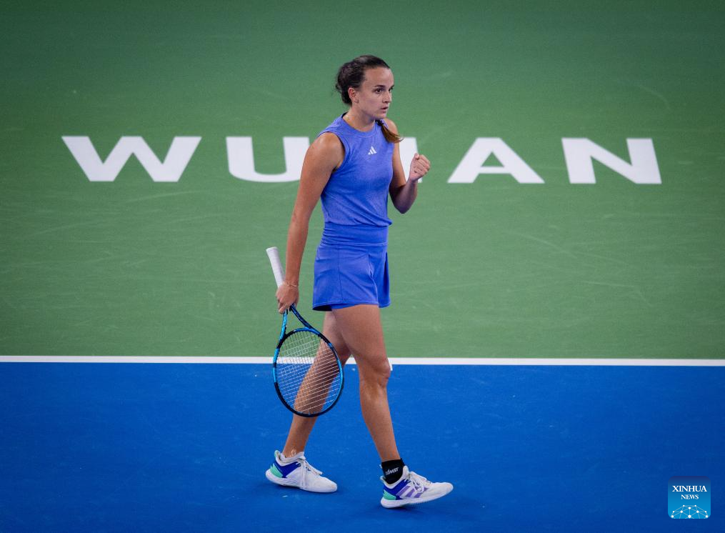 Clara Burel of France celebrates a score during the women's singles round of 64 match against Yuan Yue of China at the 2024 Wuhan Open tennis tournament in Wuhan, capital of central China's Hubei Province, Oct. 7, 2024. (Xinhua/Hu Jingwen)