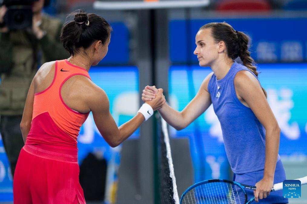 Clara Burel (R) of France and Yuan Yue of China shake hands after their women's singles round of 64 match at the 2024 Wuhan Open tennis tournament in Wuhan, capital of central China's Hubei Province, Oct. 7, 2024. (Xinhua/Wu Zhizun)