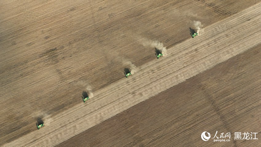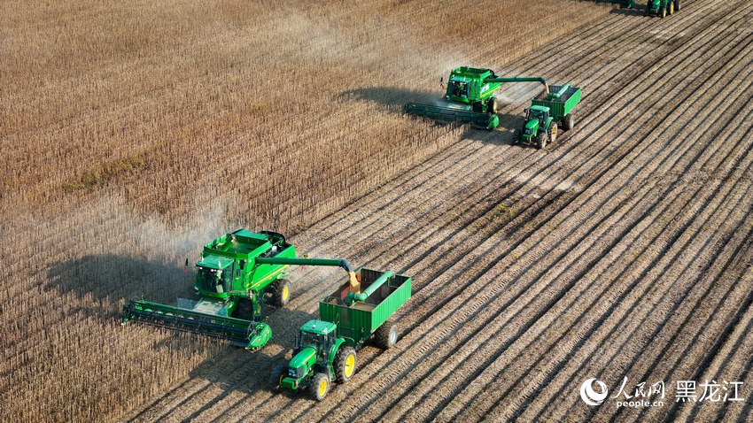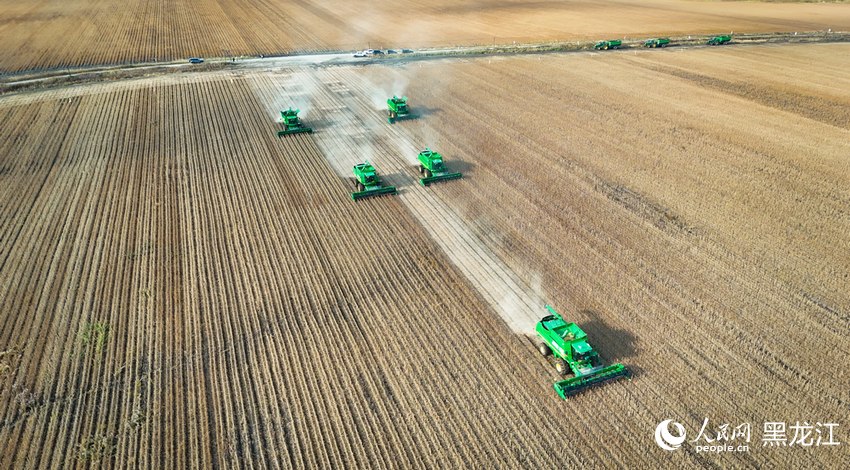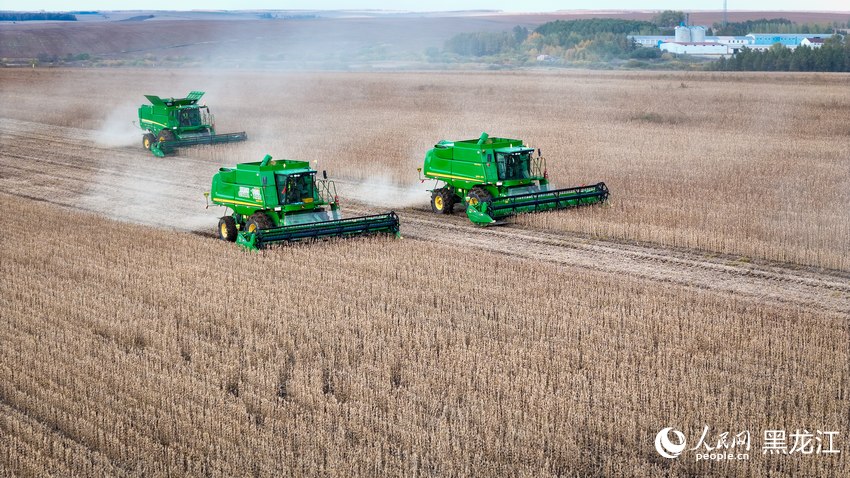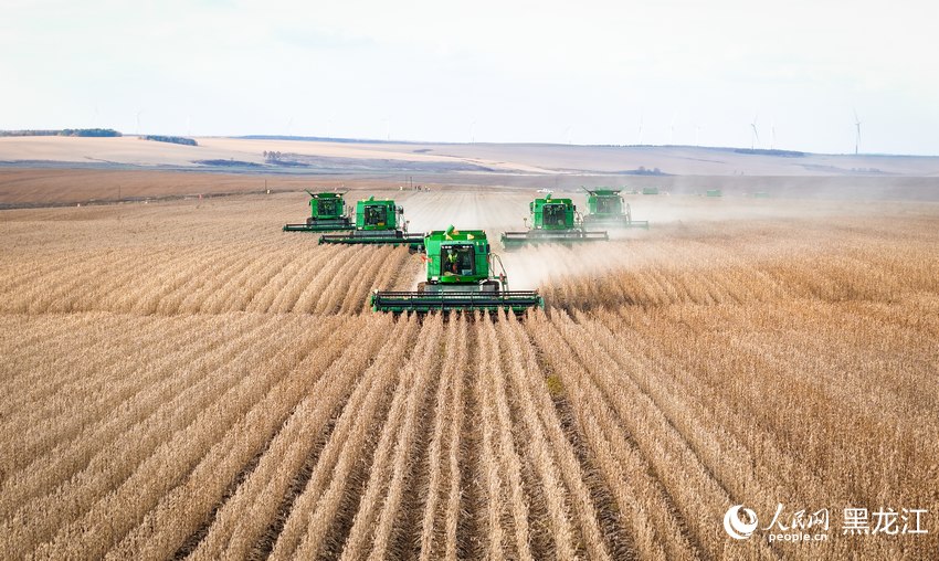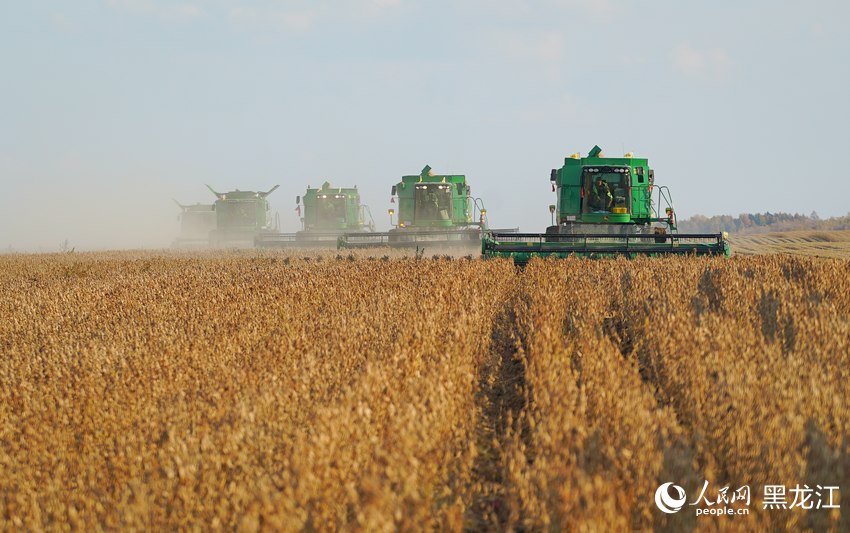 Autumn is the perfect time for the harvesting of soybeans in Beian, northeast China's Heilongjiang Province. Recently, at Plot No. 1 of the Rongtong Agricultural Development Group Co., Ltd. (Beian), several sets of high-horsepower harvesting machinery took turns tirelessly harvesting soybeans. Row by row, the beans were harvested and threshed, presenting a scene of a bountiful harvest in the golden soybean fields.