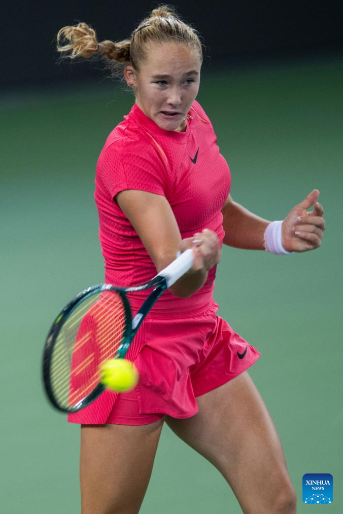 Andreeva Mirra of Russia hits a return during the women's singles round of 64 match against Wang Xiyu of China at the 2024 Wuhan Open tennis tournament in Wuhan, capital of central China's Hubei Province, Oct. 8, 2024. (Xinhua/Wu Zhizun)
