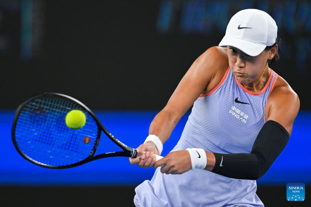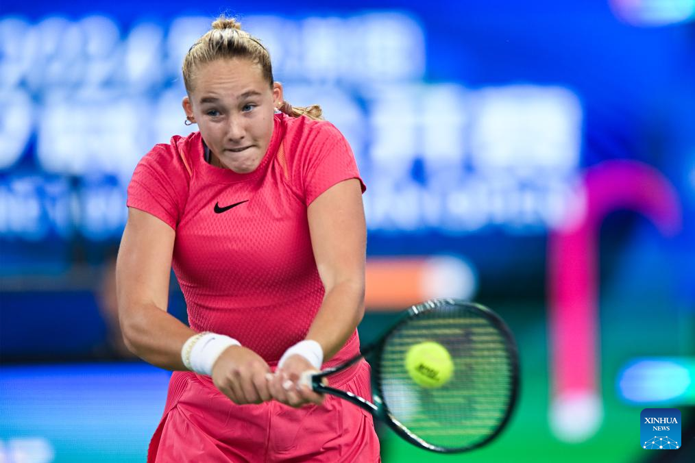 Wang Xiyu of China hits a return during the women's singles round of 64 match against Andreeva Mirra of Russia at the 2024 Wuhan Open tennis tournament in Wuhan, capital of central China's Hubei Province, Oct. 8, 2024. (Xinhua/Wu Zhizun)
