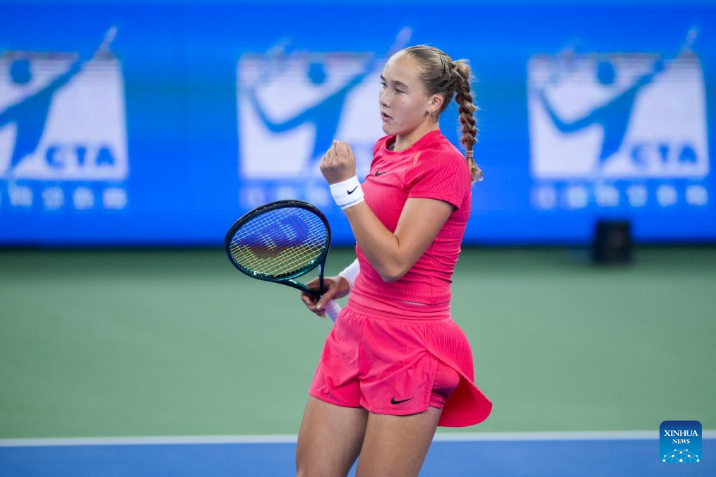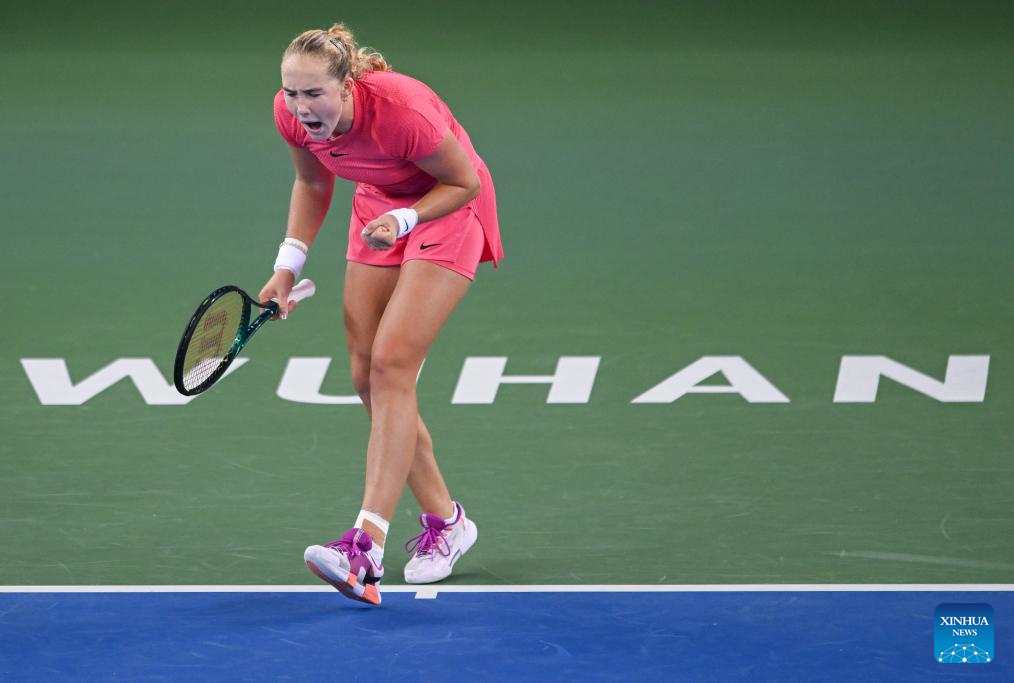 Andreeva Mirra of Russia celebrates during the women's singles round of 64 match against Wang Xiyu of China at the 2024 Wuhan Open tennis tournament in Wuhan, capital of central China's Hubei Province, Oct. 8, 2024. (Xinhua/Du Zixuan)