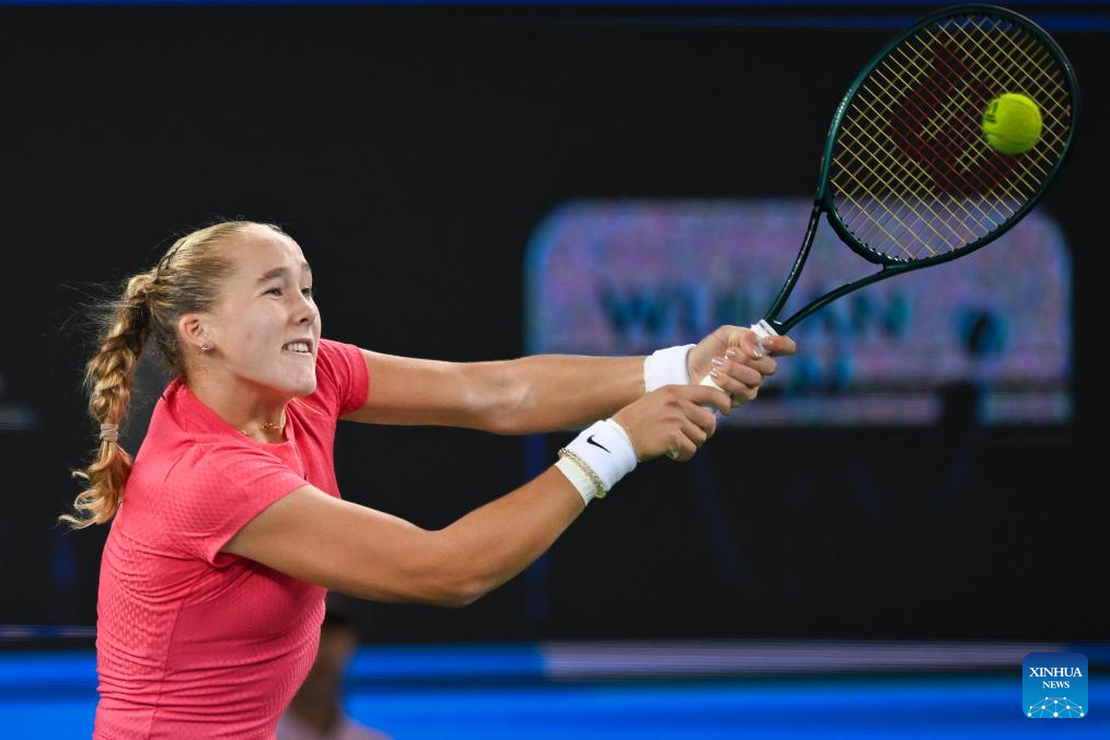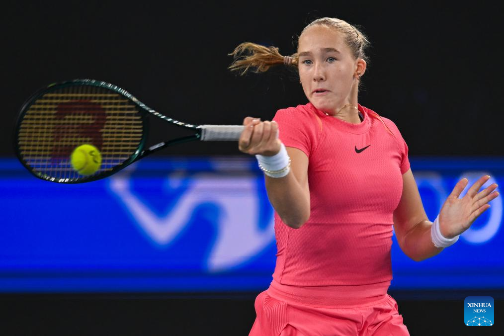 Andreeva Mirra of Russia hits a return during the women's singles round of 64 match against Wang Xiyu of China at the 2024 Wuhan Open tennis tournament in Wuhan, capital of central China's Hubei Province, Oct. 8, 2024. (Xinhua/Du Zixuan)