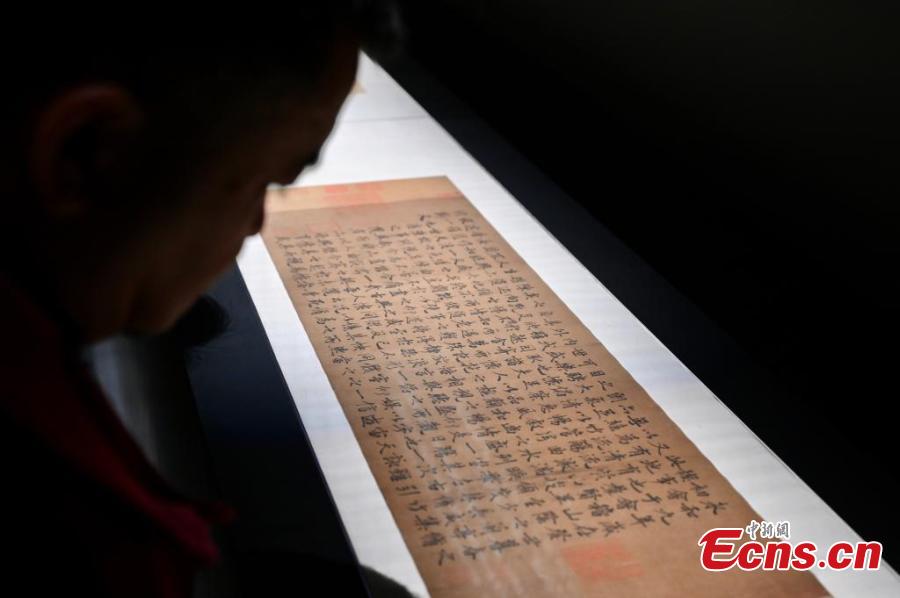 Visitors view the Preface to the Poems Composed at the Orchid Pavilion after Wang Xizhi, which was copied by the Song Emperors Renzong and Gaozong, at the Sotheby's in the Hong Kong Special Administrative Region, Oct. 8, 2024. (Photo: China News Service/Li Zhihua)