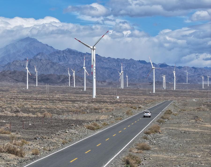An aerial drone photo taken on April 25, 2024 shows a wind farm in Dabancheng District of Urumqi, northwest China's Xinjiang Uygur Autonomous Region. (Xinhua/Chen Shuo)