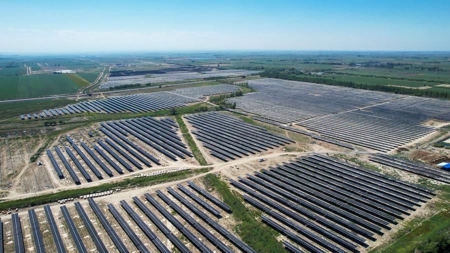 This photo taken on Aug. 22, 2023 shows a photovoltaic project in Shihezi City, northwest China's Xinjiang Uygur Autonomous Region. (Photo by Zhang Peng/Xinhua)