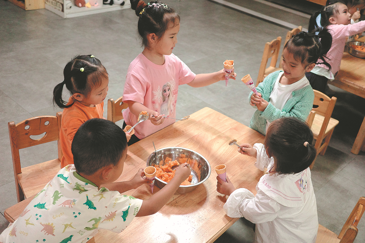 CHANGSHA — Scooping mashed sweet potato into a crispy cone and sprinkling diced melon as toppings, children in Qicai Kindergarten make sweet potato "ice cream", paired with bottled milk for a nutritious afternoon snack.