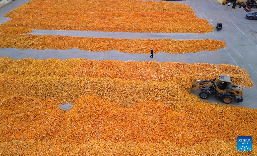 Farmers air harvested corns at Deping Township of Linyi County, east China's Shandong Province, Oct. 9, 2024. The autumn grain harvest season has begun across the country. (Xinhua/Xu Suhui)