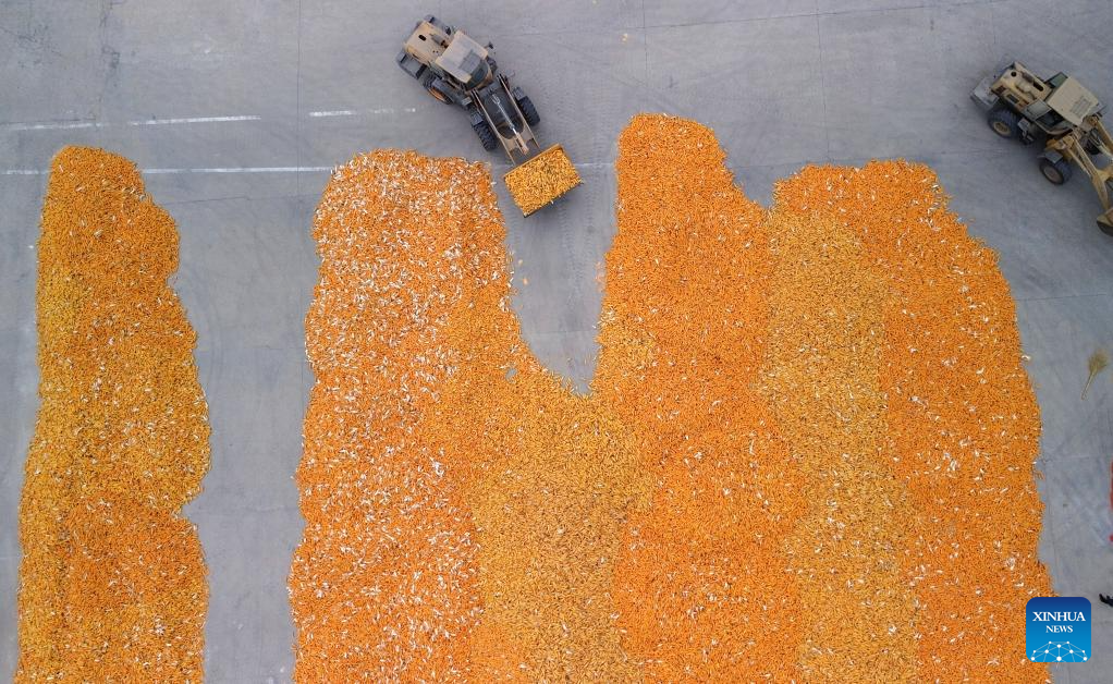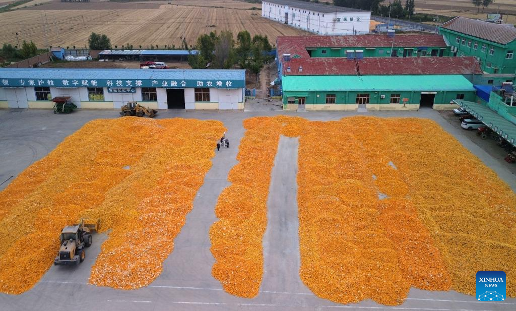 An aerial drone photo taken on Oct. 9, 2024 shows farmers driving agricultural machinery to air harvested corns at Deping Township of Linyi County, east China's Shandong Province. The autumn grain harvest season has begun across the country. (Xinhua/Xu Suhui)