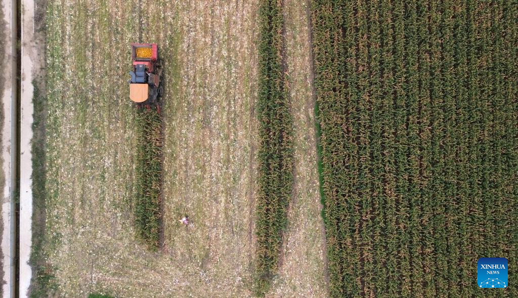 An aerial drone photo taken on Oct. 9, 2024 shows a harvester working in a corn field at Deping Township of Linyi County, east China's Shandong Province. The autumn grain harvest season has begun across the country. (Xinhua/Xu Suhui)