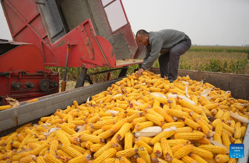 A farmer uploads harvested corns at Deping Township of Linyi County, east China's Shandong Province, Oct. 9, 2024. The autumn grain harvest season has begun across the country. (Xinhua/Xu Suhui)