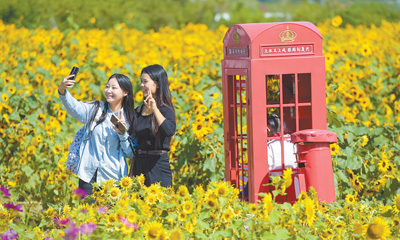 Tourists take selfies at a sunflower field in Donggaohe village, Handan city, north China's Hebei Province, Oct. 1, 2024. (Xinhua/Yue Wenting)