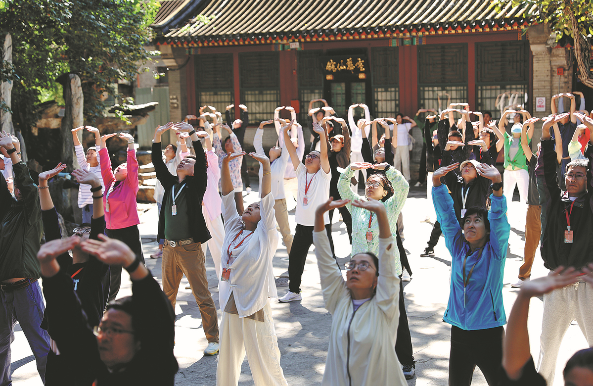 People attend the baduanjin exercise class at the temple on Sept 21. (ZOU HONG/CHINA DAILY)