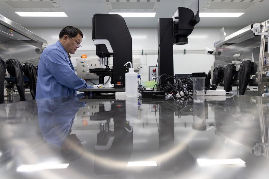 Li Chunlai, a researcher with the National Astronomical Observatories of the Chinese Academy of Sciences (CAS) and deputy chief designer of the Chang'e-6 mission, deals with lunar samples retrieved by the Chang'e-6 mission at the lunar sample laboratory in Beijing, capital of China, Sept. 24, 2024. (Xinhua/Jin Liwang)