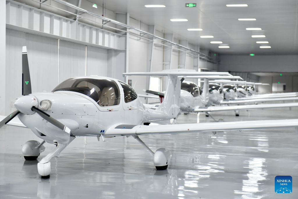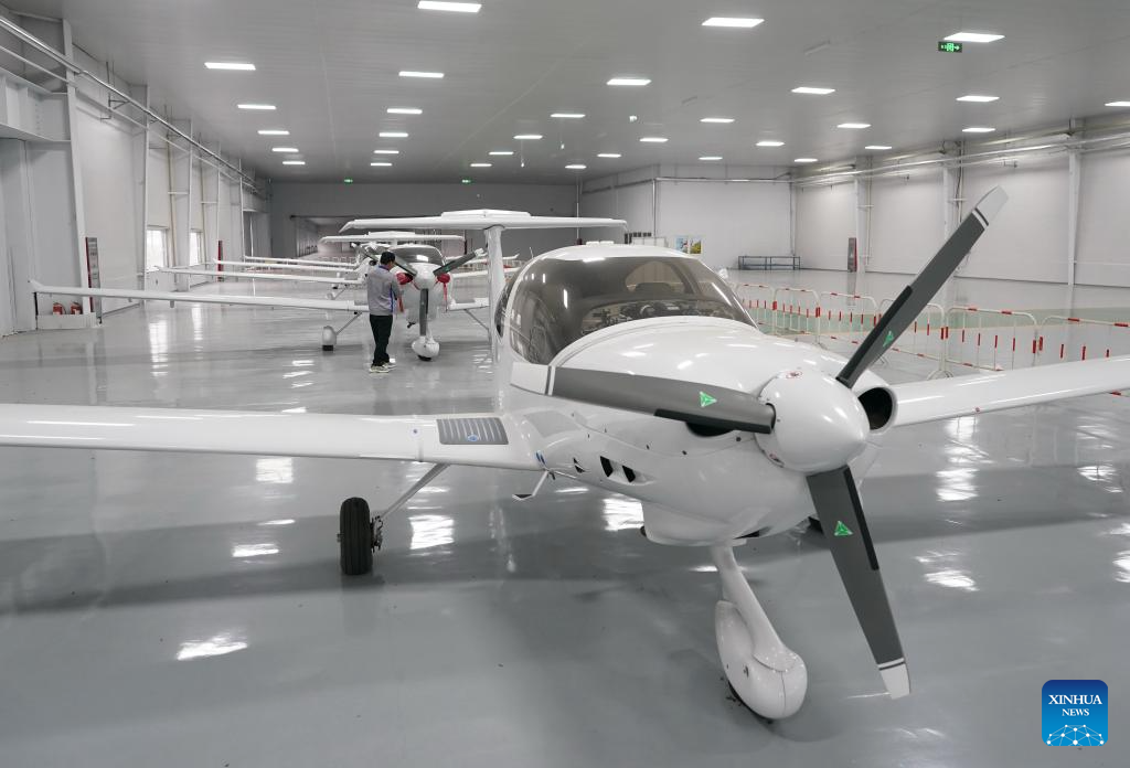 Diamond DA40 aircraft are seen at a hangar of a high-tech industrial park in Binzhou, east China's Shandong Province, Oct. 9, 2024. Binzhou City of Shandong Province has developed the low-altitude economy. The city leverages the layout of several industrial parks, along with the talent cultivation and R&D advantages of Shandong University of Aeronautics. (Xinhua/Yang Shiyao)