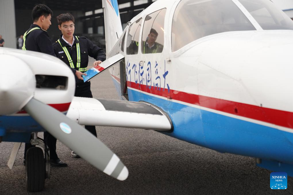 A flight trainee checks the condition of aircraft before training at Dagao General Airport in Binzhou, east China's Shandong Province, Oct. 9, 2024. Binzhou City of Shandong Province has developed the low-altitude economy. The city leverages the layout of several industrial parks, along with the talent cultivation and R&D advantages of Shandong University of Aeronautics. (Xinhua/Yang Shiyao)