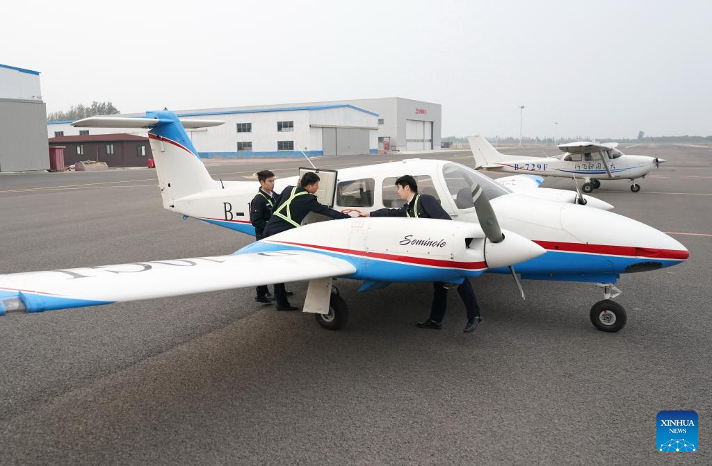 Flight trainees check the condition of aircraft before training at Dagao General Airport in Binzhou, east China's Shandong Province, Oct. 9, 2024. Binzhou City of Shandong Province has developed the low-altitude economy. The city leverages the layout of several industrial parks, along with the talent cultivation and R&D advantages of Shandong University of Aeronautics. (Xinhua/Yang Shiyao)