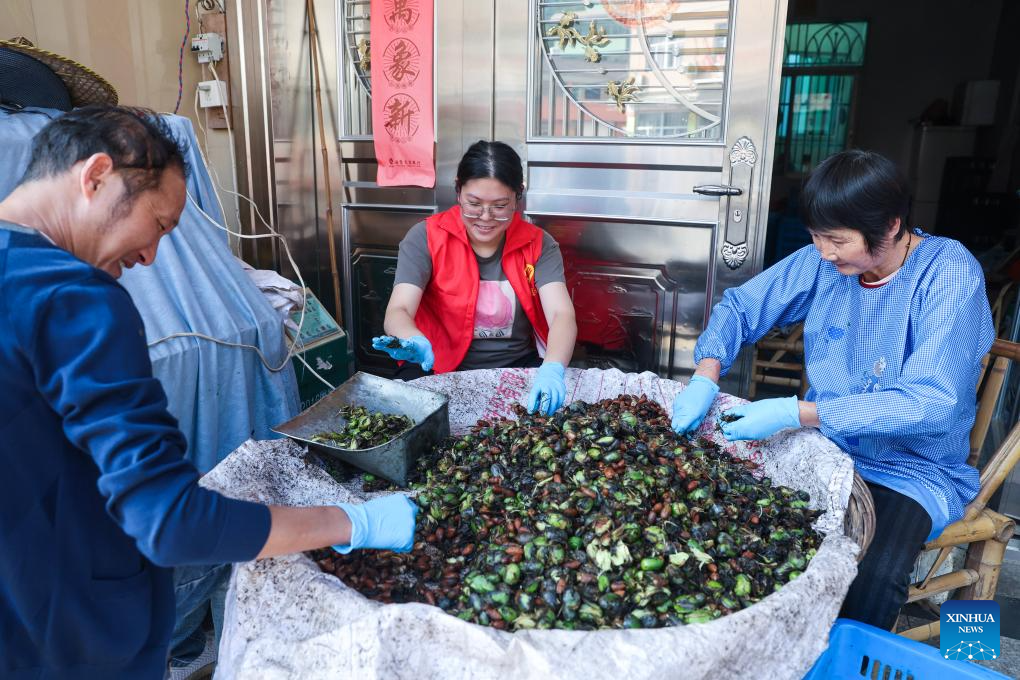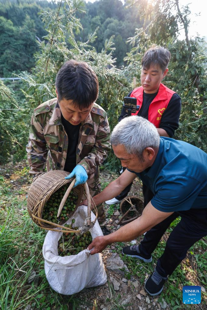 A volunteer helps farmers peel harvested Chinese torreya nuts at Xuanjiashan Village of Zhaojia Township, east China's Zhejiang Province, Oct. 10, 2024. The harvest season of Chinese torreya nuts has begun in Zhaojia Township. This township is a major production area of the Chinese torreya nuts with an annual output reaching over 5000 tonnes. (Xinhua/Xu Yu)
