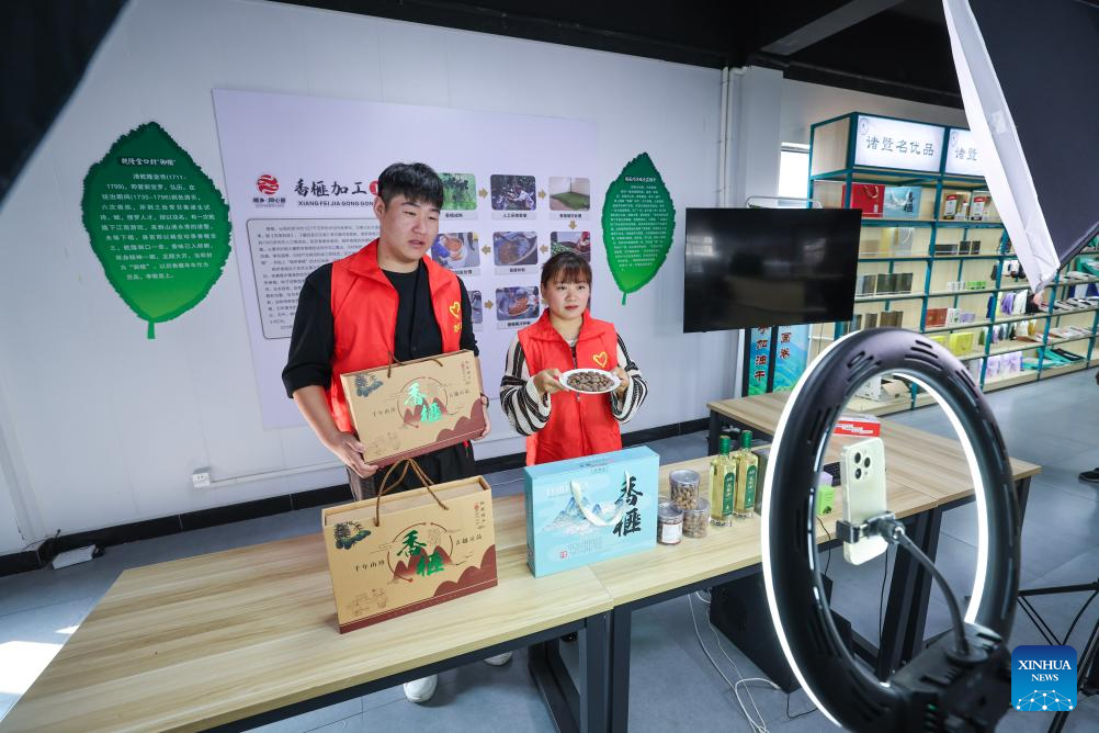 Volunteers promote Chinese torreya nuts products via livestreaming at Xuanjiashan Village of Zhaojia Township, east China's Zhejiang Province, Oct. 10, 2024. The harvest season of Chinese torreya nuts has begun in Zhaojia Township. This township is a major production area of the Chinese torreya nuts with an annual output reaching over 5000 tonnes. (Xinhua/Xu Yu)