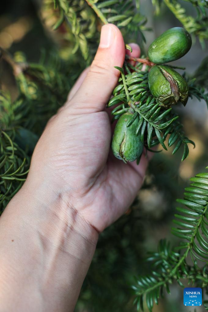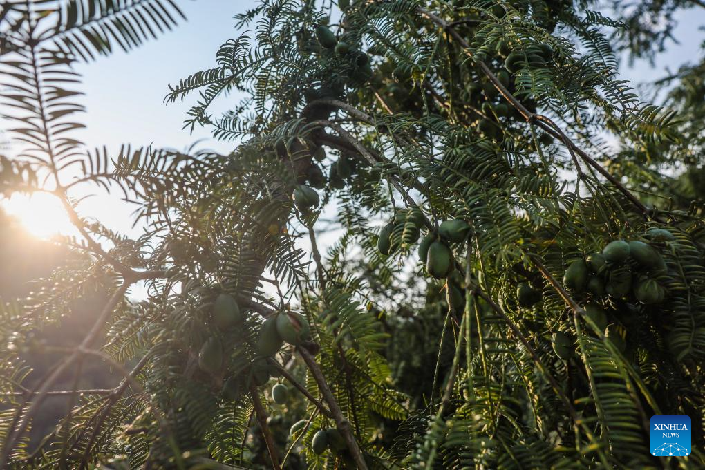 Chinese torreya nuts to be harvested are pictured at Xuanjiashan Village of Zhaojia Township, east China's Zhejiang Province, Oct. 10, 2024. The harvest season of Chinese torreya nuts has begun in Zhaojia Township. This township is a major production area of the Chinese torreya nuts with an annual output reaching over 5000 tonnes. (Xinhua/Xu Yu)