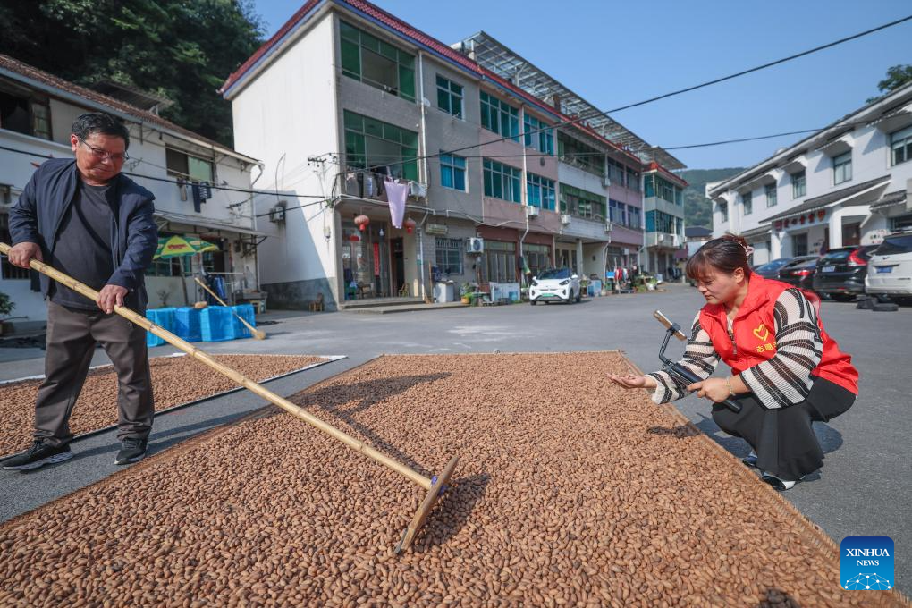 An aerial drone photo taken on Oct. 10, 2024 shows farmers airing harvested Chinese torreya nuts at Xuanjiashan Village of Zhaojia Township, east China's Zhejiang Province. The harvest season of Chinese torreya nuts has begun in Zhaojia Township. This township is a major production area of the Chinese torreya nuts with an annual output reaching over 5000 tonnes. (Xinhua/Xu Yu)