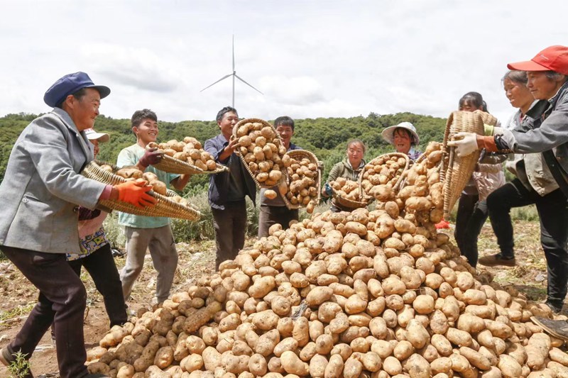Recently, potatoes planted on 120,000 mu (8,000 hectares) of fields in Weining Yi, Hui and Miao Autonomous County in southwest China's Guizhou Province have entered the harvest season. At the planting base of a potato planting and sales cooperative in the county's Xueshan township, more than 200 farmers were harvesting potatoes.