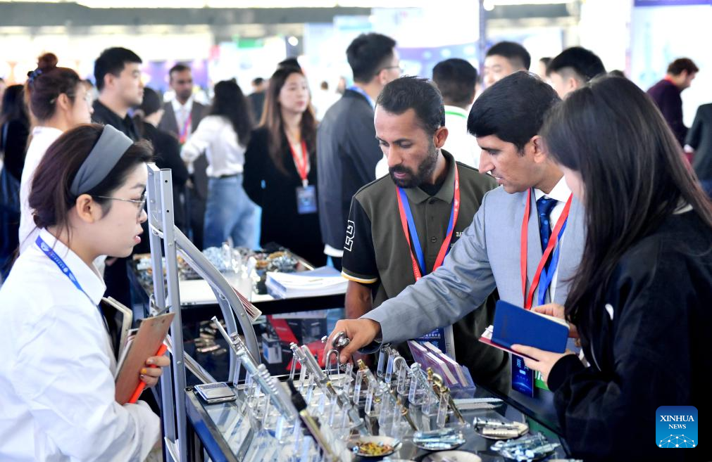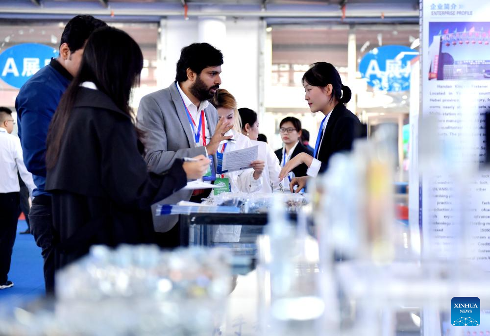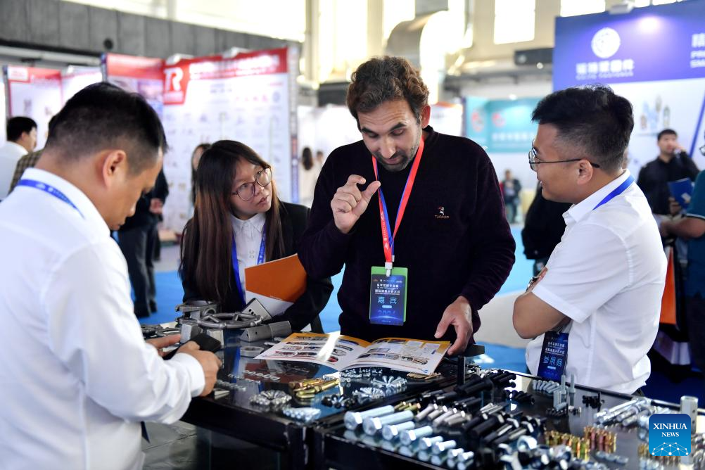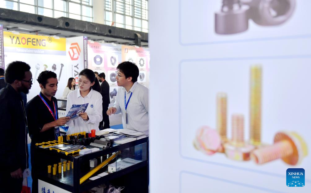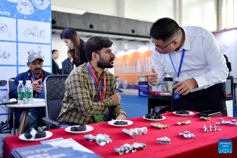 A purchaser (C) learns about the fastener products at the Yongnian fastener procurement conference in Yongnian District of Handan City, north China's Hebei Province, Oct. 10, 2024.