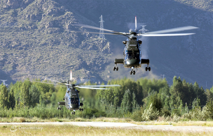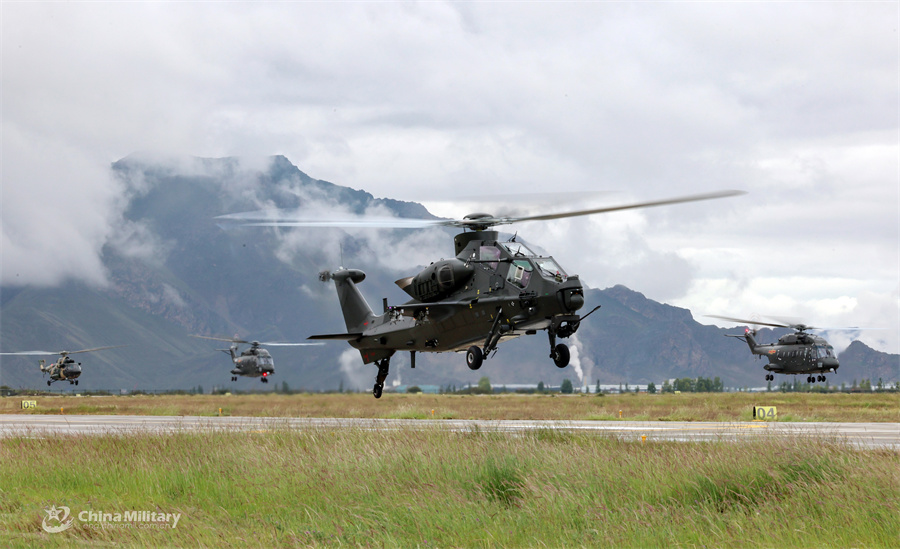 Helicopters attached to a brigade under the Chinese PLA Xizang Military Command lift off in formation during a flight training exercise on August 14, 2024. (eng.chinamil.com.cn/Photo by Hu Qiwu)