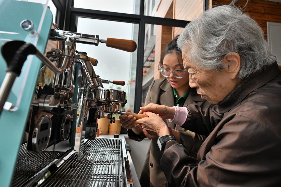 CHENGDU, Oct. 13 (Xinhua) -- At the "Unforgettable Cafe," 84-year-old barista Dai Xiuyu, under the guidance of social worker Xiao Ling, hands a freshly made cup of coffee to a customer. Yet, in the blink of an eye, Dai has already forgotten the steps she just followed, despite having practiced them many times.