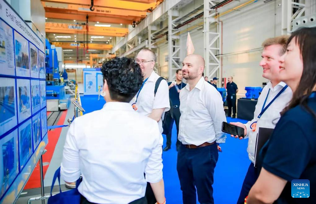 People visit the Tianjin factory of Flender Group in north China's Tianjin Municipality, July 12, 2024. Over the past 28 years, Flender, a leading global supplier of mechanical drive systems, has flourished in Tianjin, growing from a small workshop with a dozen employees to a sprawling 255,000-square-meter facility with over 2,000 staff. (Xinhua)