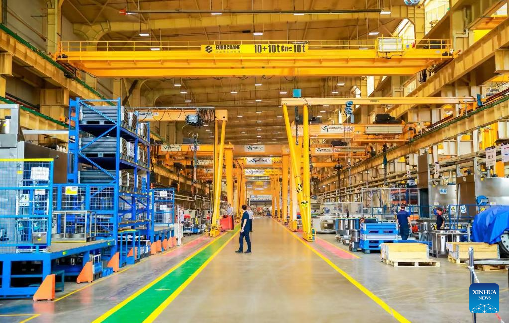 This photo taken on July 12, 2024 shows a view of the Tianjin factory of Flender Group in north China's Tianjin Municipality. Over the past 28 years, Flender, a leading global supplier of mechanical drive systems, has flourished in Tianjin, growing from a small workshop with a dozen employees to a sprawling 255,000-square-meter facility with over 2,000 staff. (Xinhua)